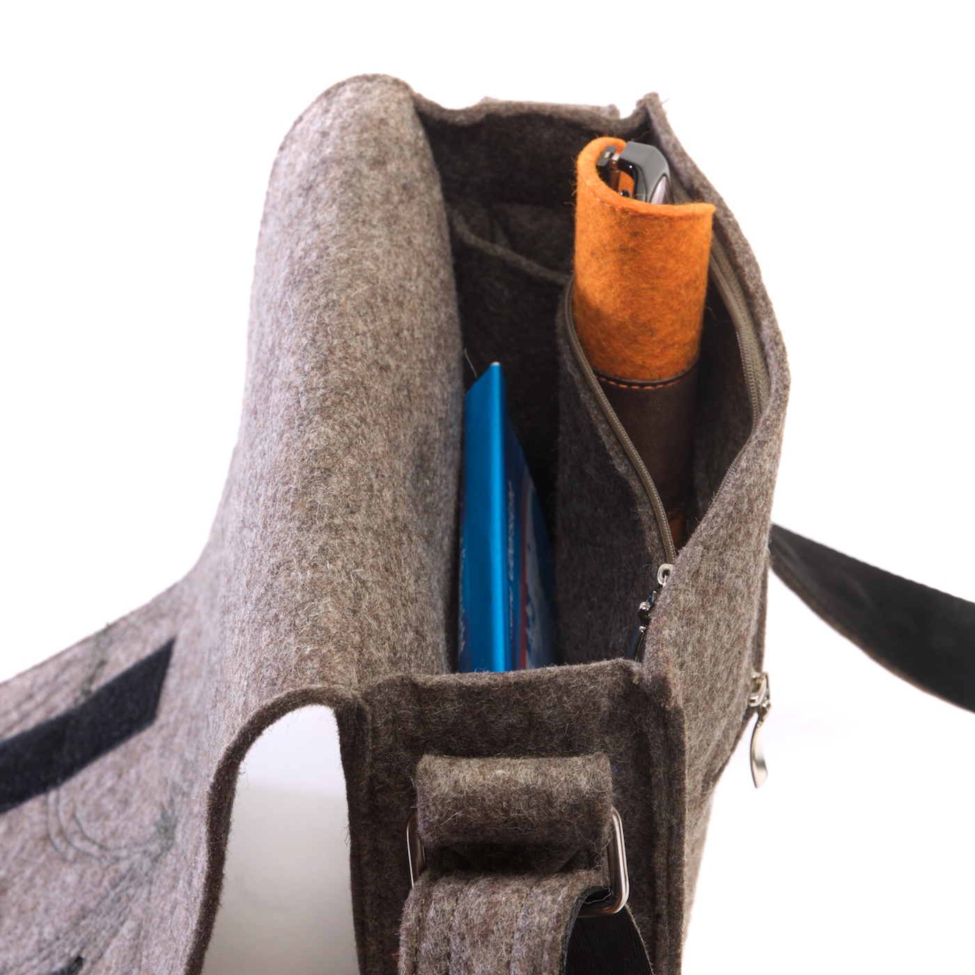 Die Umhängetasche „Jule“ wird individuell mit Leder-Applikation und freier Stickerei versehen. Somit ist jede ein Unikat. Unter der Klappe und im Innenraum befinden sich je ein Reißverschluss-Fach, damit wichtige Dinge sicher verwahrt werden können. Im Inneren gibt es ein Einsteckfach für Stifte und eins fürs Handy oder andere Kleinigkeiten, die man schnell zur Hand haben möchte. Der Gurt ist verstellbar und mit Sicherheitsgurtband verstärkt, damit er sich auch bei schwer-gewichtigem Inhalt nicht dehnt. So ausgestattet ist sie eine praktische Begleiterin durch den Alltag.