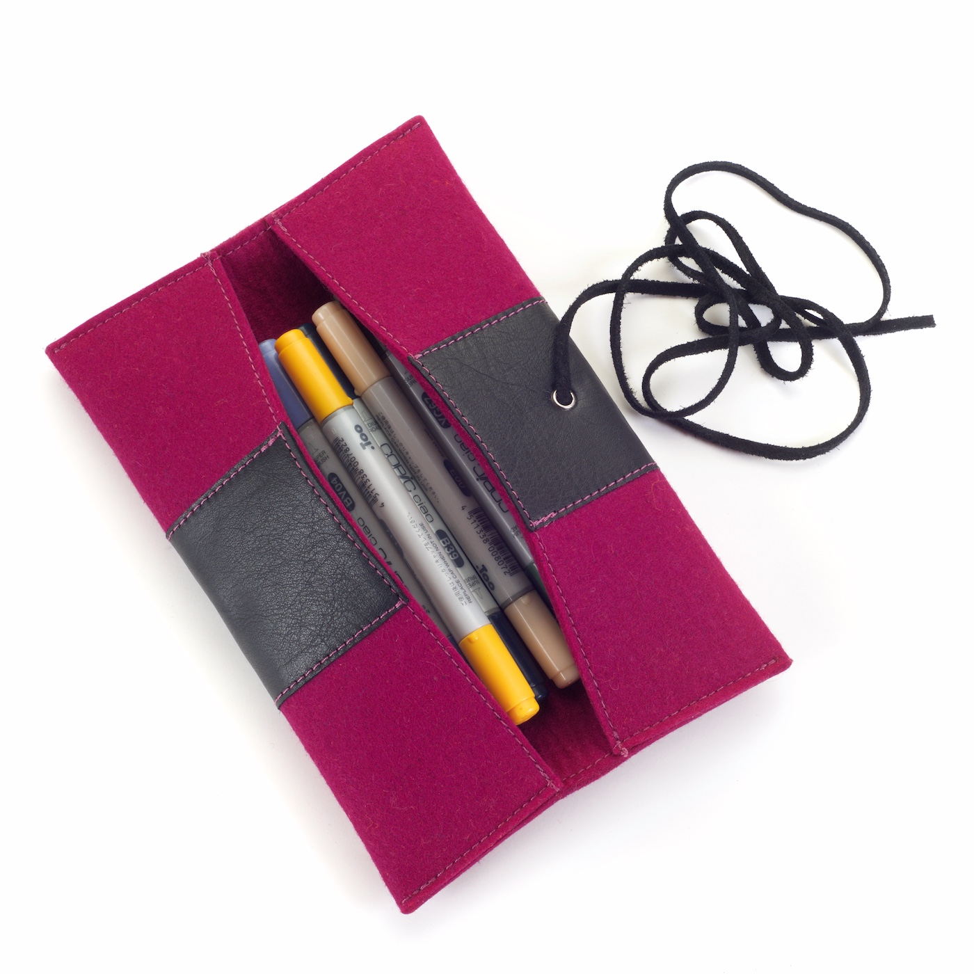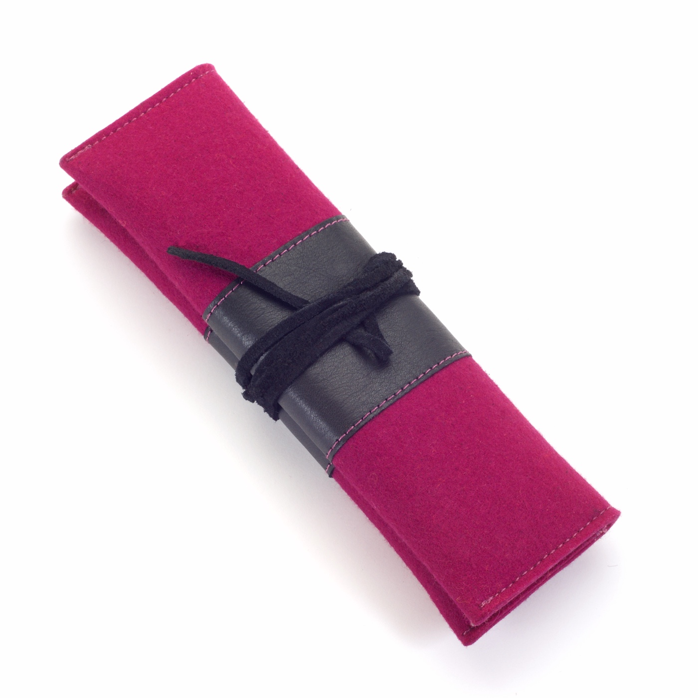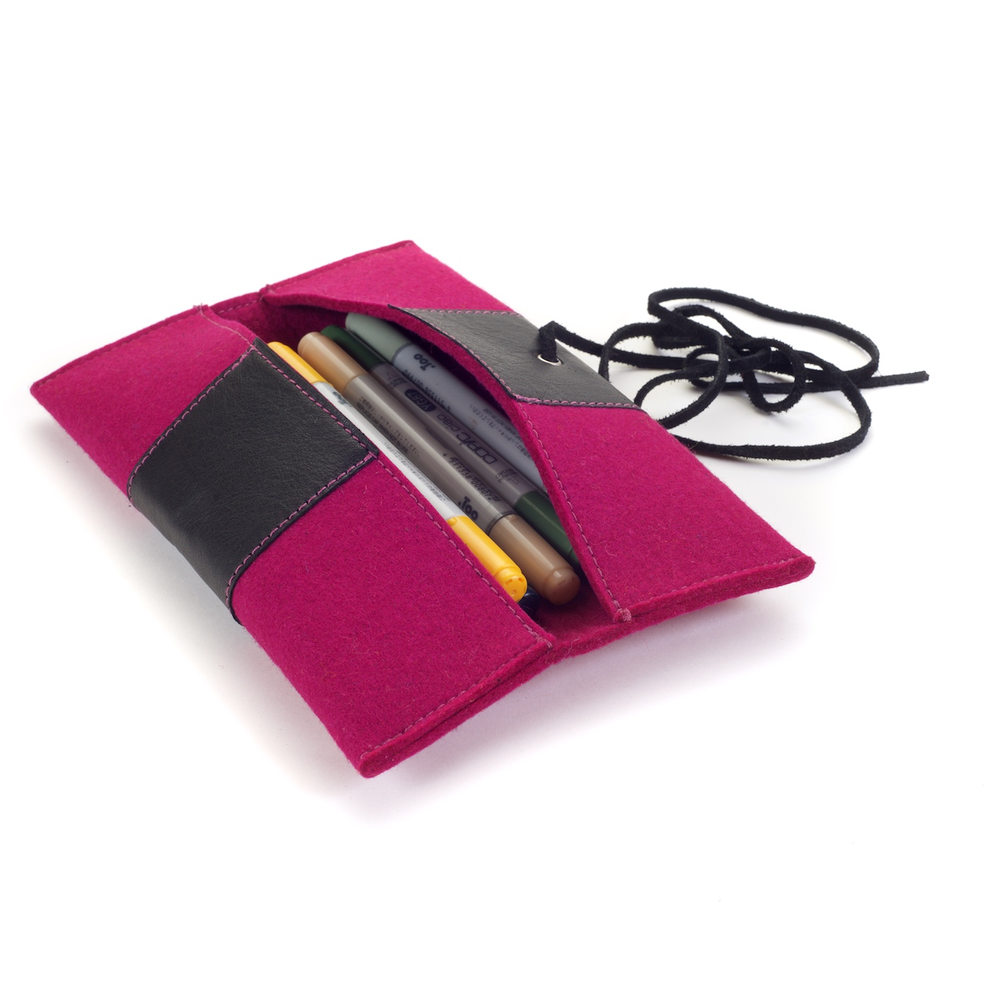 Jette ist das Wickeletui mit dem kompletten Überblick über alle Dinge, die darin aufbewahrt werden. Man kann es wie eine Schale auf den Tisch stellen und hat so immer alles im Blick, was drin ist. Es besteht die Möglichkeit, verschiedene Dinge getrennt in beiden Seiten zu verwahren. So kann es zum Beispiel sein, dass Ihre Lesebrille geschützt ist und nicht von den Stiften zerkratzt wird. Durch die Materialkombination aus Wollfilz und Leder ist es ein echter Handschmeichler.