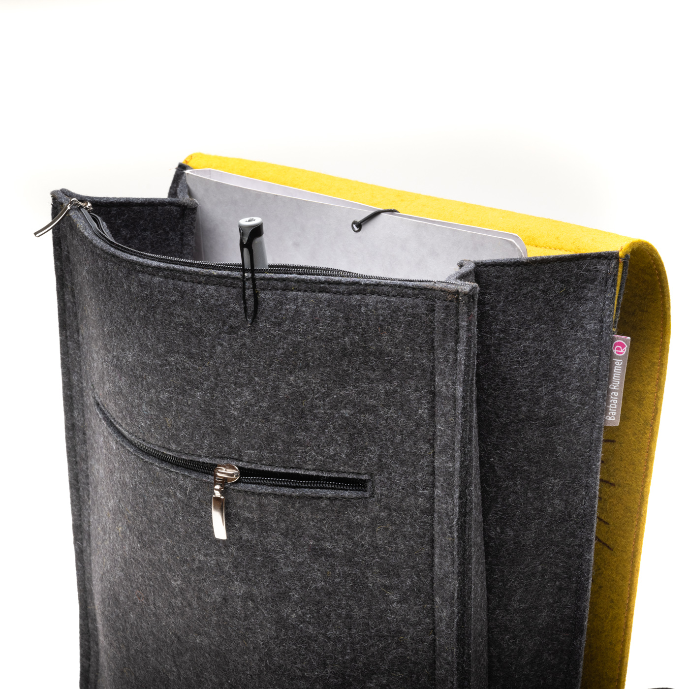 Unter der Klappe befindet sich ein Reißverschlussfach für den schnellen Zugriff. Im Inneren finden Sie neben dem Hauptfach noch ein großes Reißverschlussfach und verschiedene Einsteckfächer. So können Sie geschäftlich und privat gut sortiert unterwegs sein.