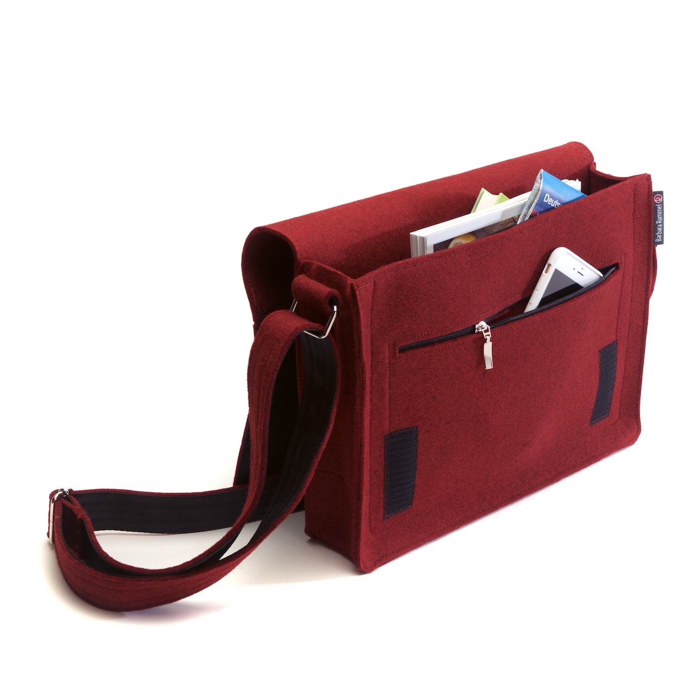Jede Umhängetasche Jule wird individuell mit Leder-Applikation und freier Stickerei versehen und ist somit ein Unikat. Unter der Klappe und im Innenraum befinden sich je ein Reißverschlussfach, damit die wichtigen Dinge sicher verstaut werden können. Im Inneren befindet sich ein Einsteckfach für Stifte und eins fürs Handy oder andere Kleinigkeiten, die man schnell zur Hand haben möchte. Der Gurt ist verstellbar und mit Sicherheitsgurtband verstärkt, damit er sich nicht dehnen kann. So ausgestattet bewältigt sie viele Alltagssituationen und ist durchaus Büro-tauglich.